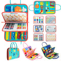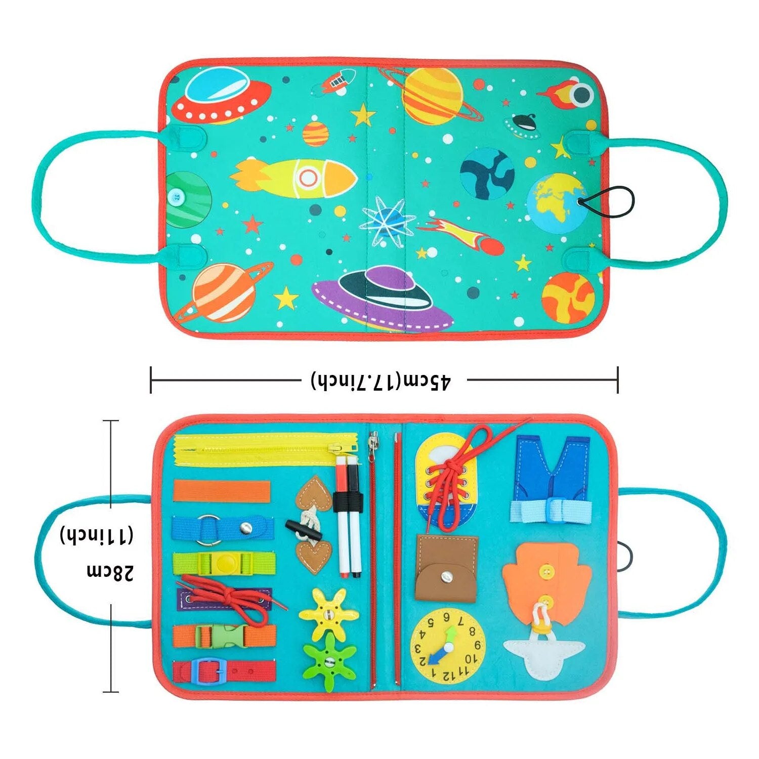 - This toddler educational travel toy is made of premium felt cotton material, The hand-held design of the busy board allows kids can carry it everywhere, which also is a veritable travel toy for airplanes, cars, and other outdoor activities